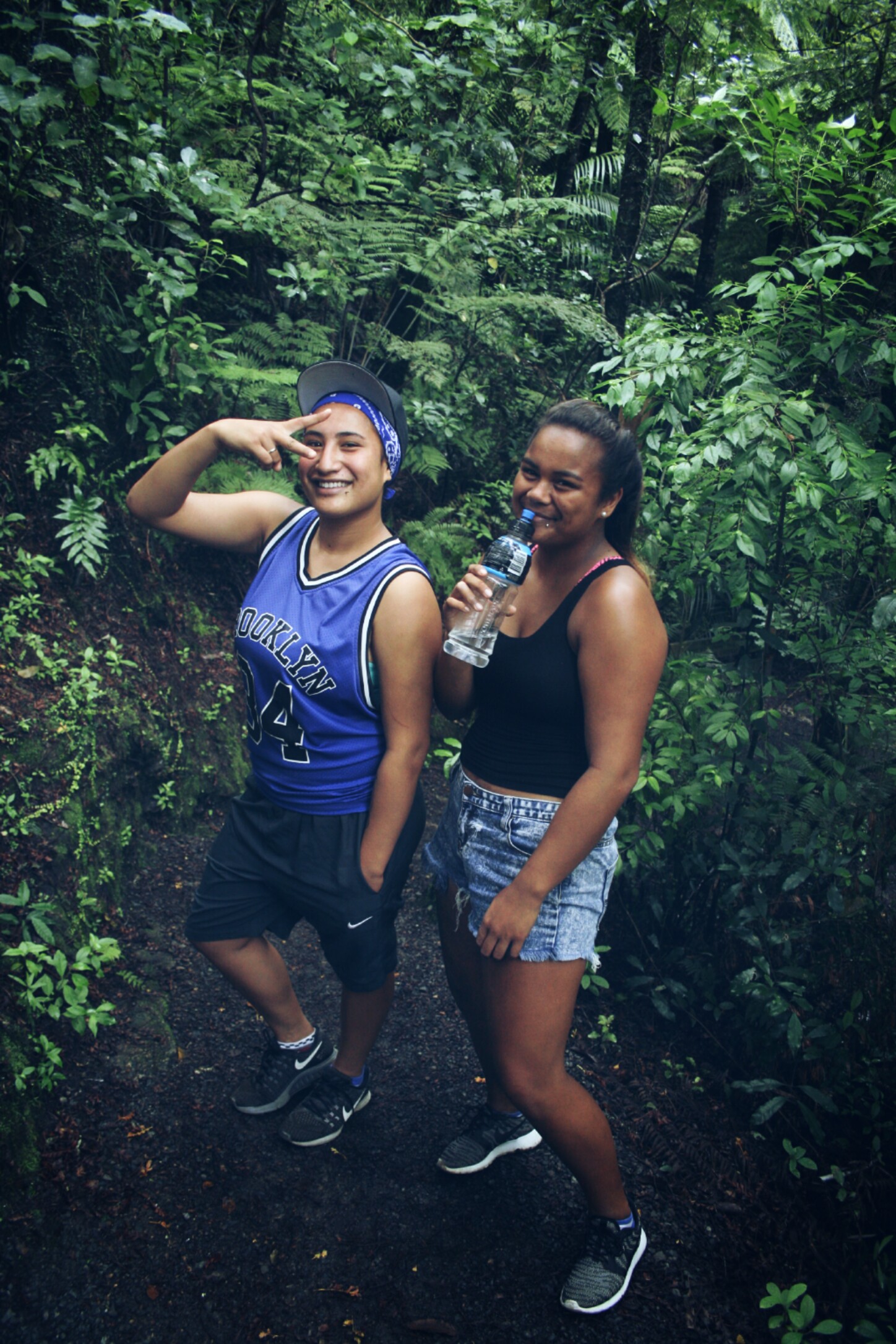 Im Dunkeln und bei strömenden Regen kamen wir in unserer Unterkunft an. Das Hostel an den Whangarei Falls war eher ein Campingplatz, aber einer von der luxuriösen Sorte mit Bücherlounge und Whirlpool, selbst das Zehnbett-Zimmer war erträglich. So sehr es am Tag meiner Ankunft auch geregnet hatte, so sonnig und warm war es schließlich die folgenden Tage und ich erkundete die Gegend zu Fuß. Zu den Whangarei Falls, dem tobenden und nebelversprühenden Wasserfall, war es nur ein kurzer Weg, doch durch den Regen war er ein gewaltiger Anblick. Entlang dem Flüsschen ging es weiter durch ein Waldstück zu alten Kauribäumen, die als “big trees” handschriftlich auf den Wegweisern vermerkt waren. Die Frische und der Geruch nach Grün war einfach das, was ich an diesem Tag brauchte. Auf dem Weg zum War Memorial, einem Aussichtspunkt, begegneten mir zwei Maori Mädchen. Sie kamen mir kichernd und Musik hörend entgegen. Als sie meine Kamera sahen, fragten sie nach einem “random photo for the camera”. Nach einem kurzen irritierten Zögern willigte ich ein und so posierten die beiden auf dem Waldweg für ein spontanes Foto. Kurz bevor sie ganz verschwunden waren, fragte ich noch nach ihren Namen, Ivy und Ja, – eine surreale Begegnung.