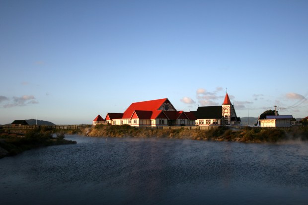 Doch nirgends sonst hatte man das Gefühl, dass die Erdkruste an dieser Stelle besonders dünn und durchlässig sei. Meine fast täglichen Spaziergänge in die Stadt führten mich am Ufer des Lake Rotorua entlang und durch ein Maoridorf, das nicht durch hohe Zäunen und stattliche Eintrittspreise vor neugierigen Blicken abgeschottet war. Hier konnte man das Gemeinschaftshaus und die Kirche bewundern, die im traditionellen Stil – weiße Wände und rostrote Holzverkleidungen – gebaut waren. Wahrscheinlich war im Sommer auch mehr los im Dorf. Im Winter erschien die Gegend etwas eingeschlafen.