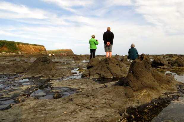 Man sollte den Wald am Besten bei Ebbe besuchen, sonst holt man sich nasse Füße. Der Fotograf der Postkarte schien das in Kauf genommen zu haben. Ich besaß jedoch keine Gummistiefel und für ein barfüßiges Unterfangen war es schlicht zu kalt. Glücklicherweise kam ich genau zur richtigen Zeit an und ich konnte bei Ebbe trockenen Fußes durch den ehemaligen Urwald spazieren. Die Bucht war voller Besucher, die wie ich die alten Baumstümpfe bewunderten. Es war faszinierend, wie gut man die Maserung und Jahresringe der alten Baumriesen erkennen konnte. Man sieht es leider nicht so gut auf diesen Bildern, die eher die Vulkankruste der Stümpfe zeigen, anstatt die richtigen Versteinerungen im Inneren. Doch wie man sieht, habe ich den Ort der Postkartenaufnahme finden können. Es hat eine ganze Weile gedauert. Ausschlaggebend war am Ende das richtige Verhältnis der beiden Klippen im Hintergrund. Die Versteinerungen sehen leicht anders aus, was ich mir mit der ständigen Erosion durch Ebbe und Flut erkläre. Doch die Abstände und grundsätzlichen Formen stimmen überein. Diesmal war es wirkliche detektive Fotoarbeit und es hat richtig Spaß gemacht! Ich hätte noch einige Zeit länger an diesem Ort verbringen können, hätten mich die Schwärme von blutrünstigen Sandfliegen nicht vertrieben. Doch ich hatte, was ich wollte!